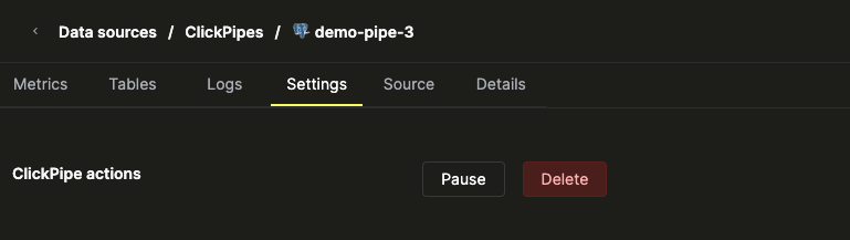 - На вкладке Источники данных нажмите на MySQL ClickPipe, который вы хотите приостановить.